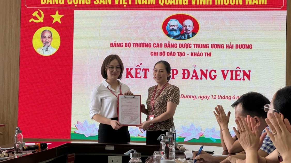 Sáng 12/06/2024, tại phòng Hội thảo, Trường Cao đẳng Dược Trung ương Hải Dương, Chi bộ Đào tạo - Khảo thí (trực thuộc Đảng bộ trường) đã tổ chức Lễ kết nạp đảng viên mới cho quần chúng ưu tú Đỗ Thị Dung - Cán sự phòng Quản lý Đào tạo – Khoa học Công nghệ và Hợp tác quốc tế.