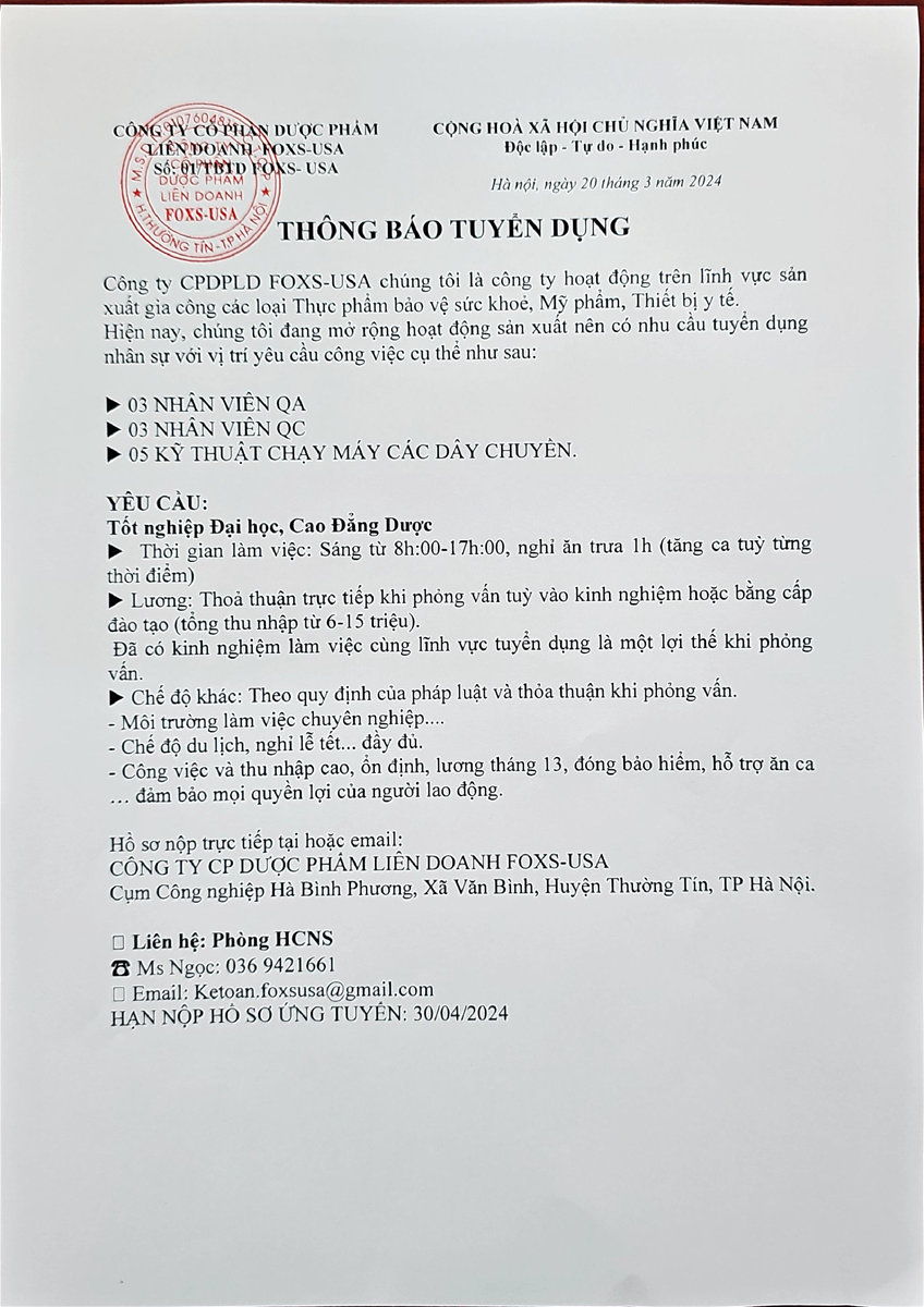 Công ty CPDPLD FOXS-USA tuyển dụng