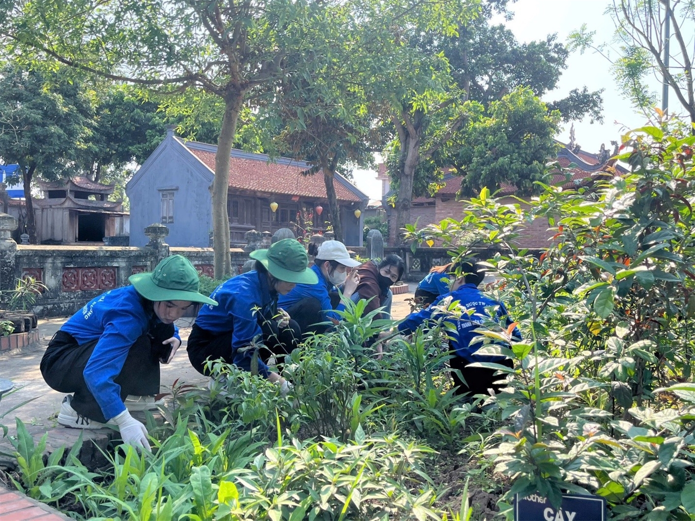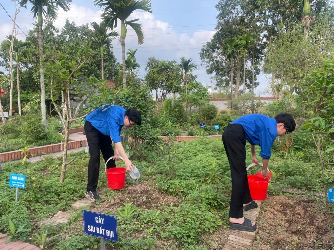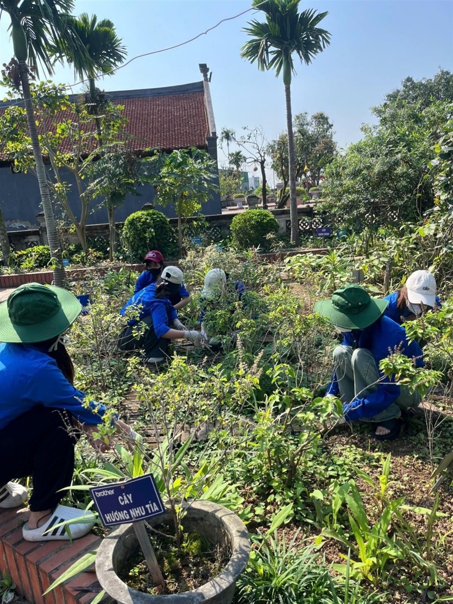 Đoàn viên, sinh viên chăm sóc vườn cây thuốc nam tại Đền Bia