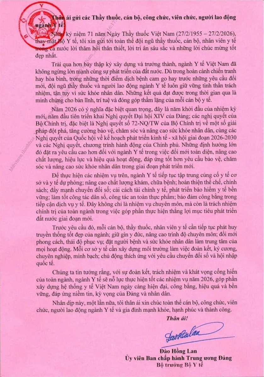 Toàn văn bức thư chúc mừng của bộ trưởng Bộ Y tế