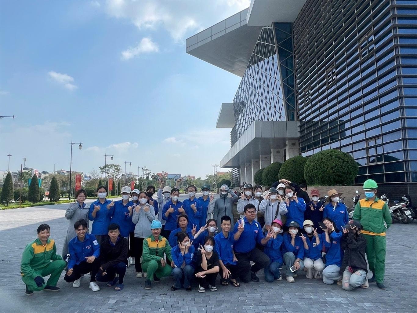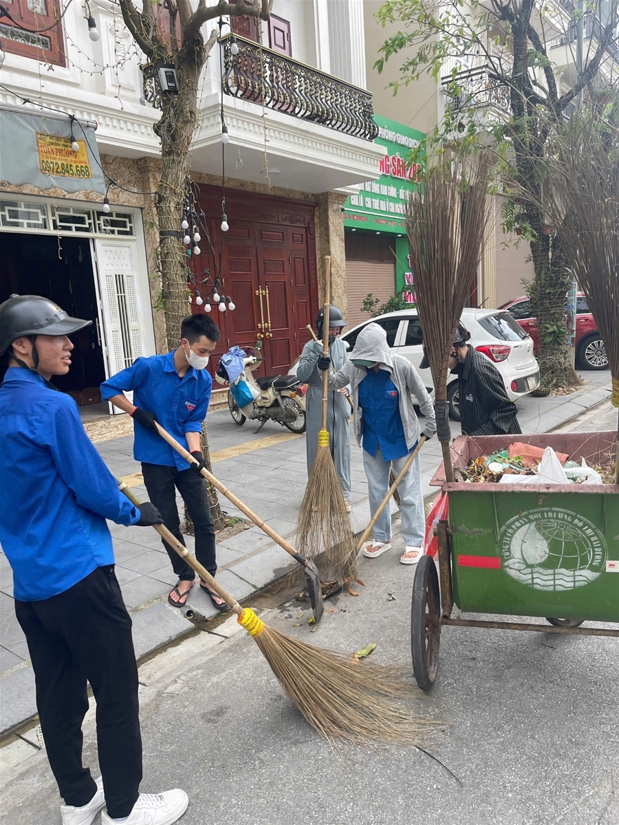 Sinh viên nhà trường hỗ trợ các cô, chú Công ty cổ phần Môi trường đô thị Hải Dương dọn dẹp các tuyến đường