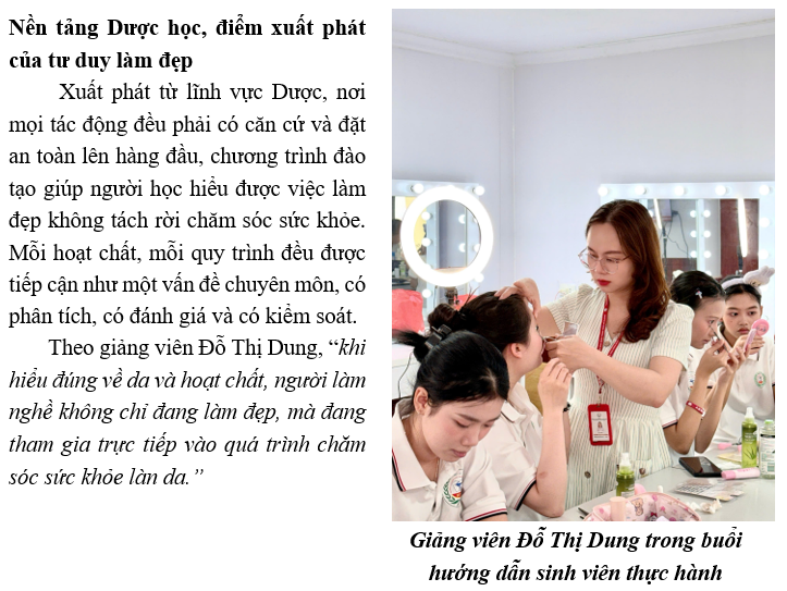Trong thế giới làm đẹp, ai cũng có thể học một kỹ thuật nhưng không phải ai cũng hiểu điều gì đang xảy ra dưới làn da. Sự khác biệt nằm ở đó. Khi chăm sóc sắc đẹp chỉ dừng lại ở thao tác, kết quả có thể đến nhanh nhưng cũng dễ sai. Còn khi được dẫn dắt bởi khoa học sức khỏe, mỗi lựa chọn đều có cơ sở, mỗi can thiệp đều có giới hạn, và mỗi kết quả đều được kiểm soát. Đây cũng là hướng đi mà Trường Cao đẳng Dược Trung ương Hải Dương lựa chọn: phát triển ngành Chăm sóc sắc đẹp từ gốc rễ của khoa học sức khỏe, với nền tảng cốt lõi là Dược học.