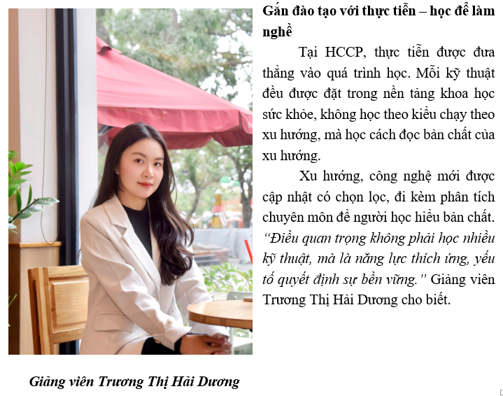 Giữa rất nhiều con đường để bước vào ngành làm đẹp, HCCP chọn một lối đi không dễ: đi chậm hơn ở điểm bắt đầu, nhưng vững hơn về nền tảng. Nơi khác dạy bạn làm đẹp. HCCP dạy bạn hiểu cái đẹp và chịu trách nhiệm với nó.
