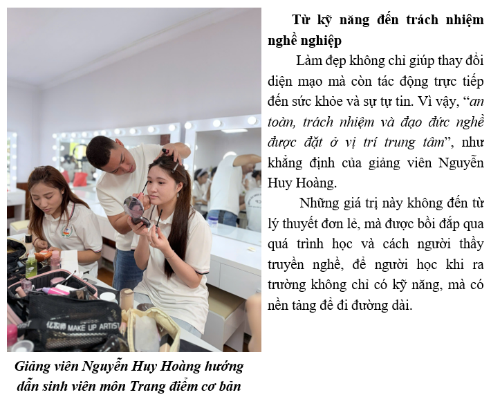 Ngành Chăm sóc sắc đẹp mở ra nhiều cơ hội, từ kỹ thuật viên đến quản lý, khởi nghiệp với chuỗi Spa... Nhưng cơ hội luôn đi kèm sàng lọc. Đây cũng là điều mà giảng viên Hoàng Thị Quỳnh Ngân và Tăng Thị Dung luôn chia sẻ với sinh viên, lợi thế không nằm ở việc bắt đầu sớm, mà ở việc bắt đầu đúng, với nền tảng vững, kỹ năng chắc và thái độ nghiêm túc. Trong một thị trường cạnh tranh, hiểu sâu mới tạo nên khác biệt.