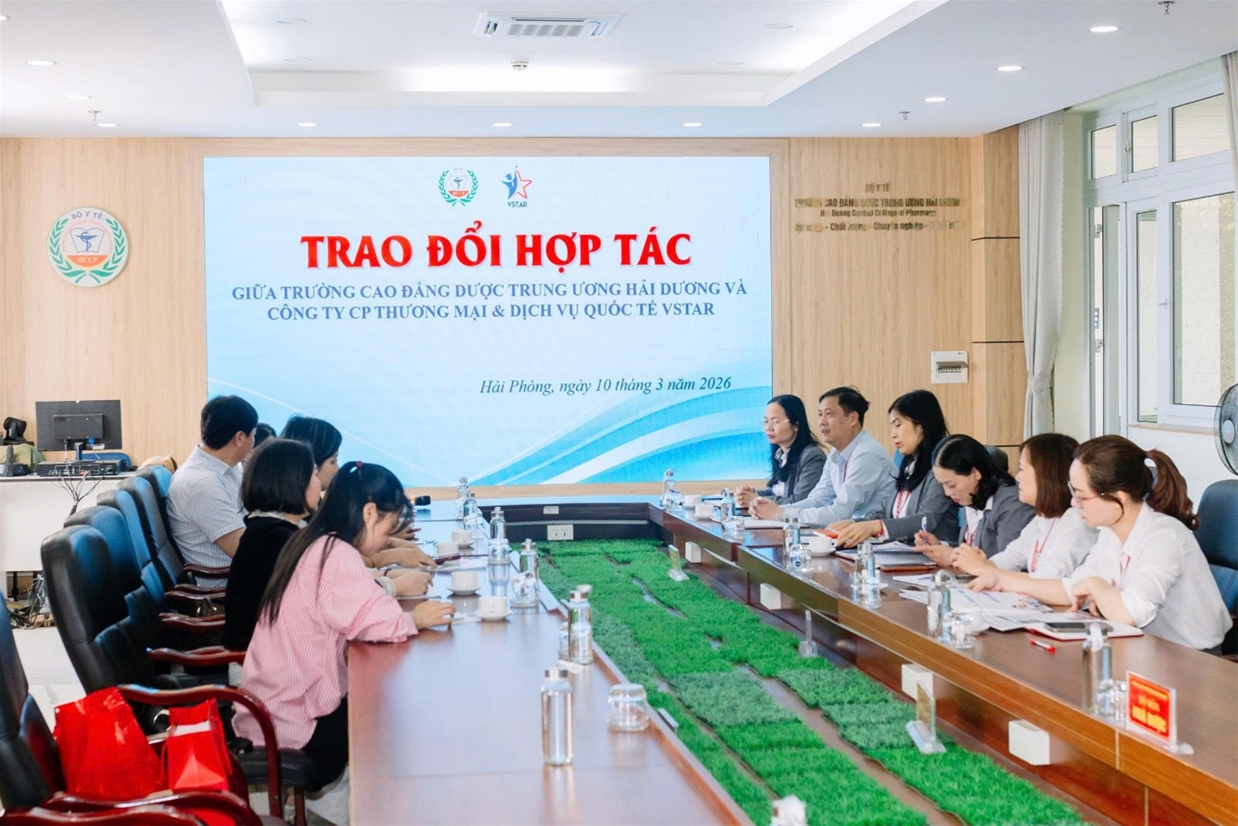 Chiều ngày 10/3/2026, tại Trường Cao đẳng Dược Trung ương Hải Dương đã diễn ra buổi làm việc giữa nhà trường và Công ty Cổ phần Thương mại và Dịch vụ Quốc tế Vstar (Công ty) nhằm trao đổi về định hướng hợp tác phát triển các chương trình du học Hàn Quốc dành cho học sinh, sinh viên.