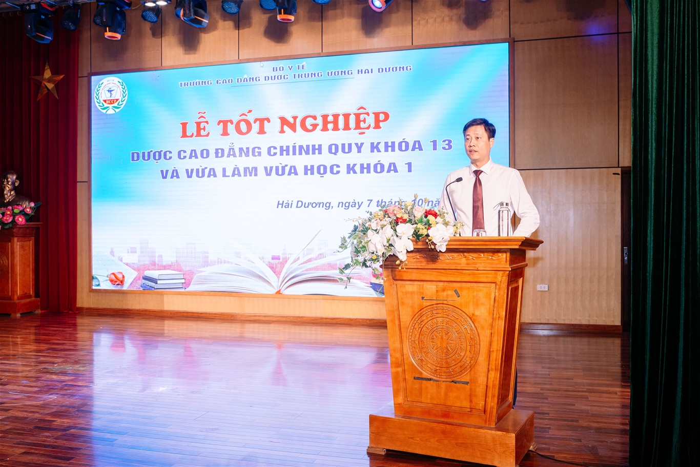 Phát biểu tại buổi lễ, TS.Trần Bá Kiên đã gửi lời chúc mừng tới 228 tân cử nhân dược cao đẳng đã vượt mọi khó khăn về điều kiện địa lý, hoàn cảnh gia đình, tình hình dịch bệnh COVID-19 để hoàn thành tốt nhiệm vụ khóa học. TS.Trần Bá Kiên cũng nhắn nhủ, nhà trường mong muốn mỗi em sinh viên khi tốt nghiệp từ mái trường Cao đẳng Dược Trung ương Hải Dương sẽ tiếp tục không ngừng phấn đấu, tu dưỡng rèn luyện về mọi mặt để hoàn thiện bản thân, góp phần thực hiện tốt nhất vai trò của mình trong sự nghiệp cao cả - chăm sóc, bảo vệ sức khỏe nhân dân và Cao đẳng Dược Trung ương Hải Dương mãi luôn là nơi các em tìm thấy hạnh phúc trong “ngày trở về” trên hành trình vặn dặm cuộc đời của mình.