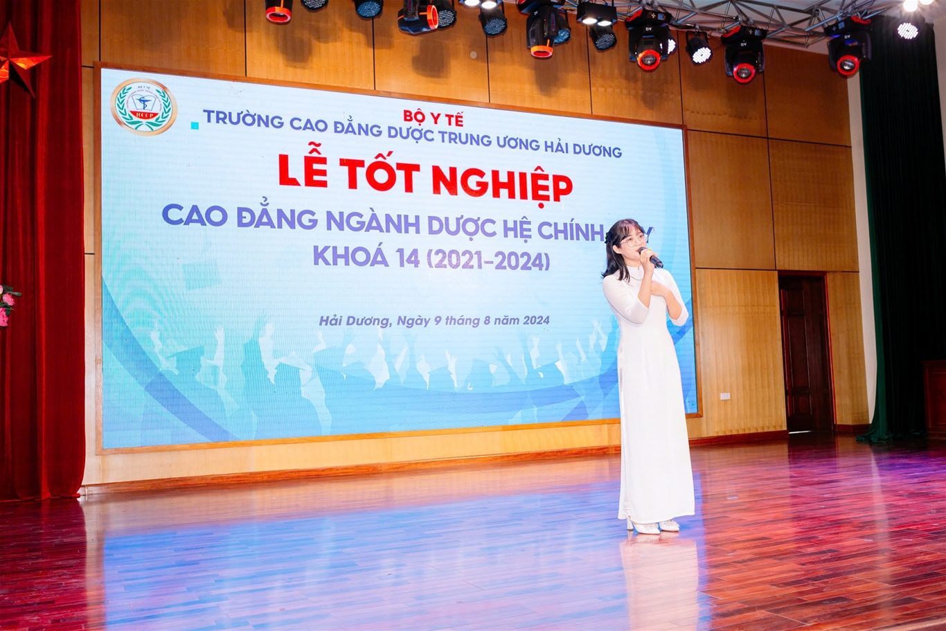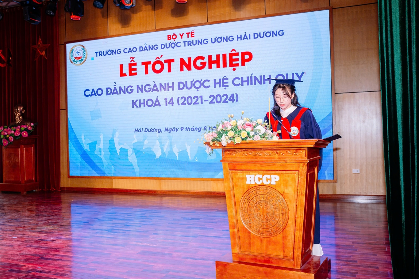 Thay mặt cho các cử nhân tân khoa, sinh viên Nguyễn Ngọc Thúy An – Lớp trưởng lớp định hướng chất lượng cao đã xúc động bày tỏ lòng biết ơn với thầy cô giáo, cán bộ nhà trường trong suốt quãng thời gian được là sinh viên của mái trường Cao đẳng Dược Trung ương Hải Dương. Thúy An cũng chia sẻ về những cảm xúc, những ấn tượng sâu sắc về hành trình chọn lựa và quyết tâm theo học ngành Dược của các bạn sinh viên khóa 14 tại trường.