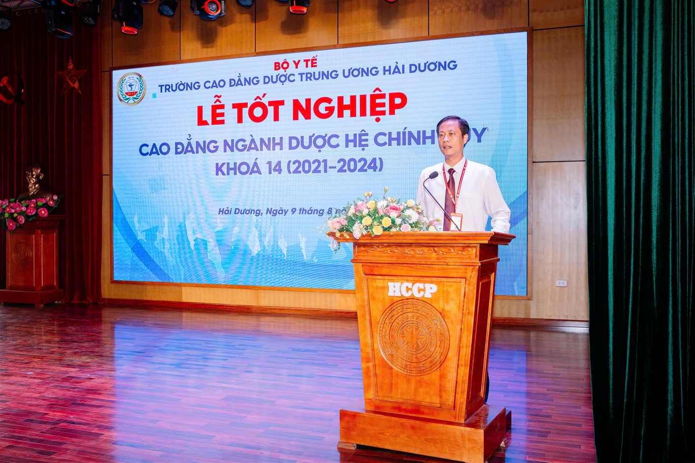 Phát biểu tại buổi lễ, TS.Trần Bá Kiên đã gửi lời chúc mừng tới 242 tân cử nhân dược cao đẳng đã vượt mọi khó khăn về điều kiện địa lý, hoàn cảnh gia đình, tình hình dịch bệnh COVID-19 để hoàn thành tốt nhiệm vụ khóa học. TS.Trần Bá Kiên gửi lời cảm ơn sự tin tưởng của các bậc phụ huynh, các em sinh viên đã lựa chọn theo học tại trường Cao đẳng Dược Trung ương Hải Dương và mong muốn các bậc phụ huynh và các em sẽ tiếp tục góp phần lan tỏa sâu rộng những giá trị, uy tín, thương hiệu của nhà trường tới cộng đồng. Đồng thời, TS.Trần Bá Kiên cũng nhắn nhủ tới mỗi em sinh viên khi tốt nghiệp từ mái trường sẽ tiếp tục không ngừng phấn đấu, tu dưỡng rèn luyện về mọi mặt để hoàn thiện bản thân, góp phần thực hiện tốt nhất vai trò của mình trong sự nghiệp chăm sóc, bảo vệ sức khỏe nhân dân và trường Cao đẳng Dược Trung ương Hải Dương mãi luôn chào đón các em “trở về”.