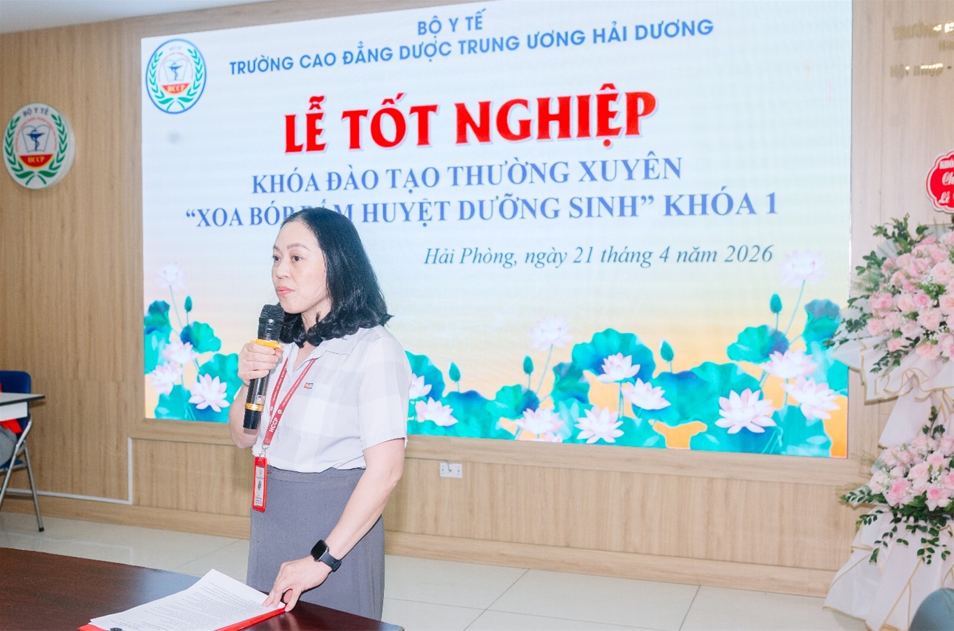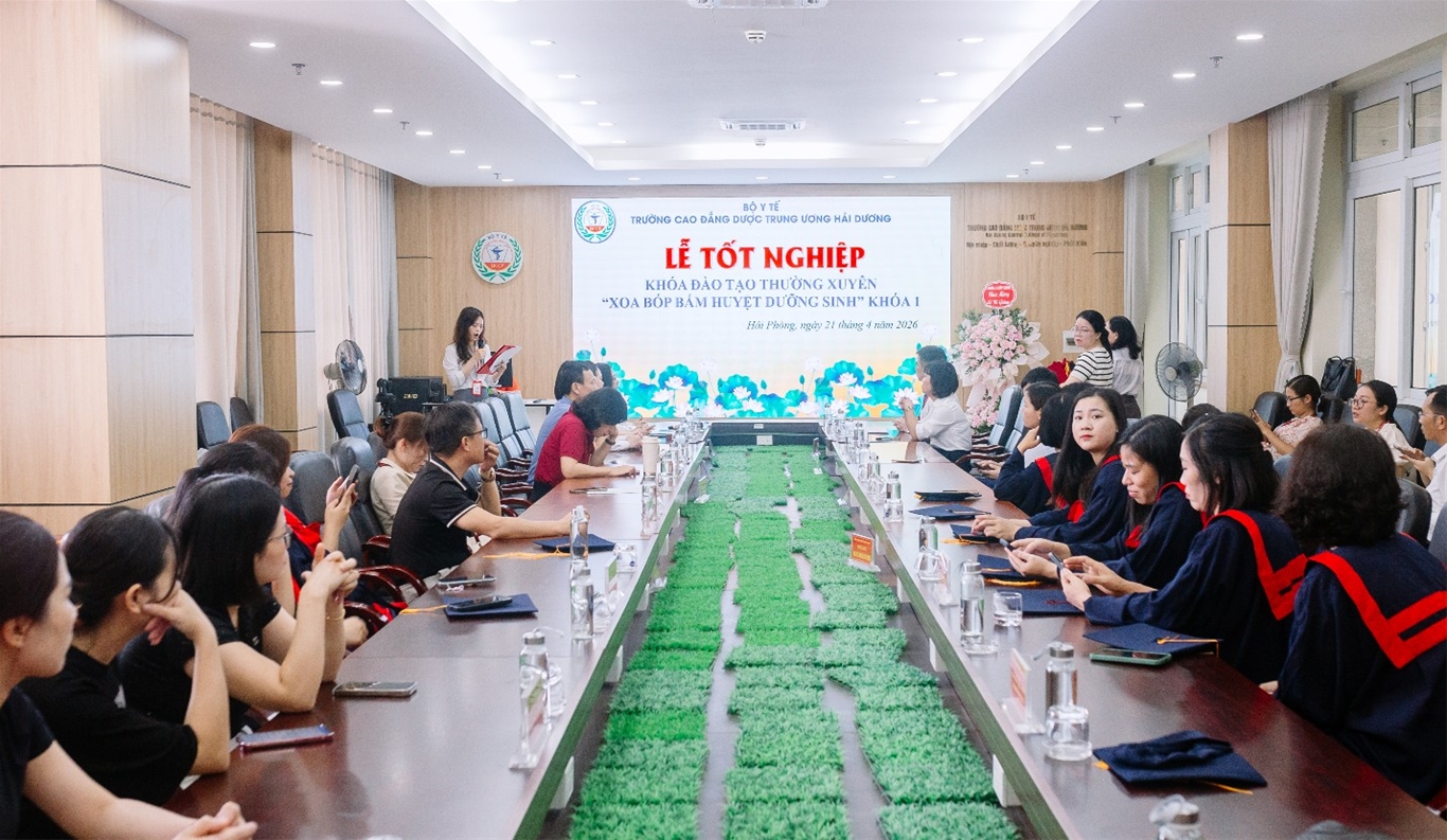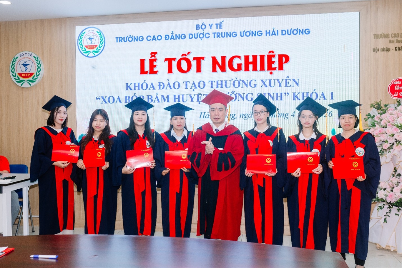 Chiều ngày 21/04/2026, Trường Cao đẳng Dược Trung ương Hải Dương (HCCP) đã long trọng tổ chức Lễ tốt nghiệp và trao chứng chỉ chương trình đào tạo Xoa bóp bấm huyệt dưỡng sinh khóa I. Trong khuôn khổ chương trình, nhà trường đã tiến hành ký kết hợp tác với Công ty Cổ phần Sen Tím – doanh nghiệp hoạt động trong lĩnh vực khách sạn và dịch vụ chăm sóc sức khỏe, nổi tiếng với khách sạn đạt tiêu chuẩn 3 sao quốc tế, tích hợp Spa chuyên về trị liệu dưỡng sinh cao cấp. Sự kiện không chỉ đánh dấu bước trưởng thành của học viên, mà còn mở ra hướng liên kết chặt chẽ giữa nhà trường và doanh nghiệp, góp phần nâng cao chất lượng đào tạo gắn với nhu cầu thực tiễn, tạo điều kiện cho học viên được thực hành nghề nghiệp, nâng cao tay nghề, đồng thời mở rộng cơ hội việc làm sau tốt nghiệp.