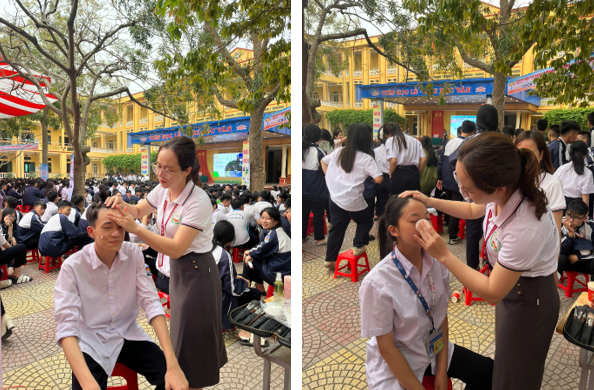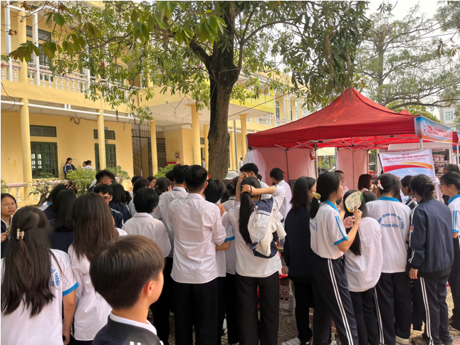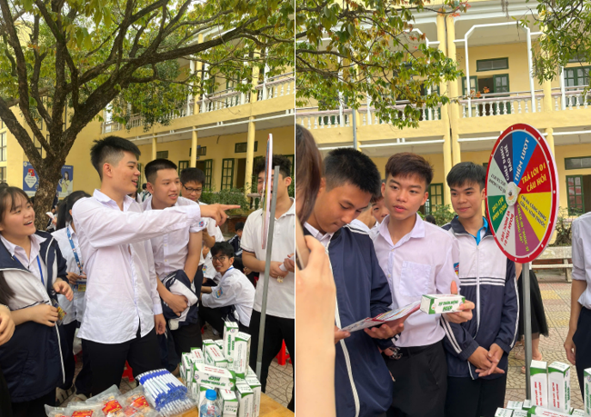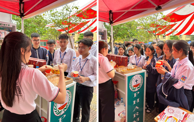 Học sinh hào hứng tham gia các trò chơi tương tác “đuổi hình bắt chữ”, “vòng xoay nghề nghiệp”, check-in cùng áo blouse hay thưởng thức trà đông trùng hạ thảo do nhà trường nghiên cứu, sản xuất…