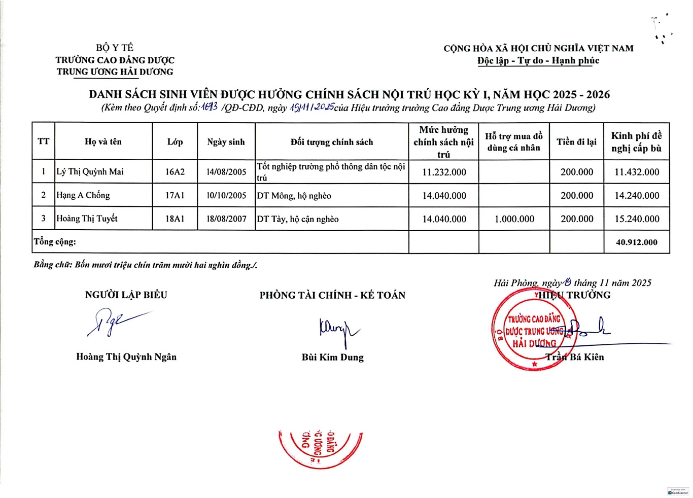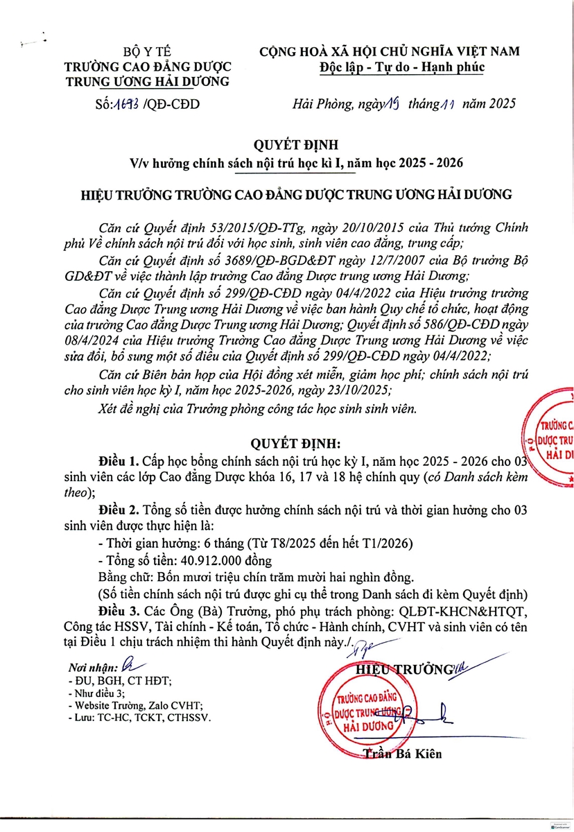 QUYẾT ĐỊNH VỀ VIỆC HƯỞNG CHÍNH SÁCH NỘI TRÚ HỌC KÌ I, NĂM HỌC 2025-2026
