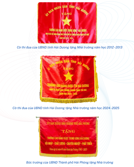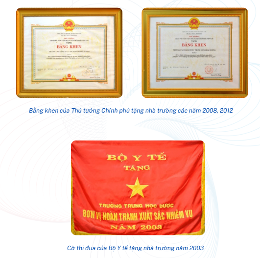 - Bằng khen của Chủ tịch UBND tỉnh Hải Dương tặng nhà trường “Đã có thành tích xuất sắc trong công tác đào tạo nhân lực ngành Dược, góp phần phát triển kinh tế xã hội địa phương giai đoan 2010 - 2015”.