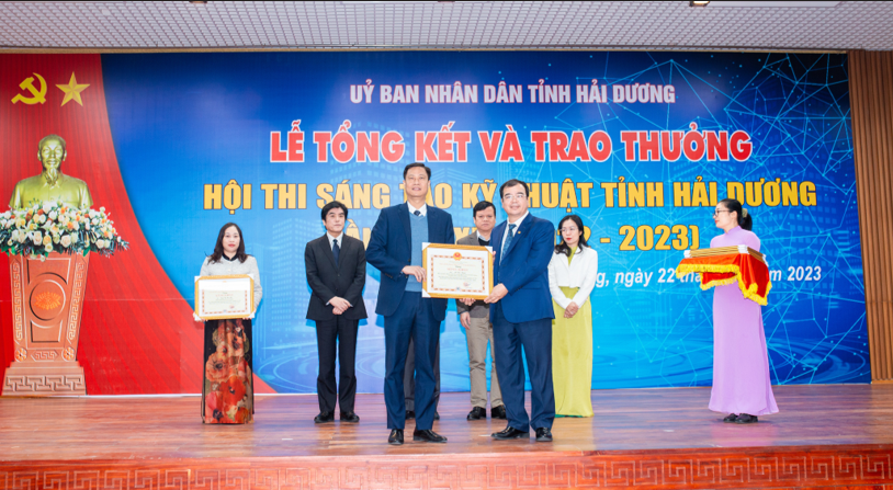 Đồng chí Nguyễn Minh Hùng Phó chủ tịch UBND tỉnh Hải Dương trao bằng khen của UBND tỉnh Hải Dương và đại diện quỹ VIFOTEC trao bằng khen cho nhóm tác giả của nhà trường đạt giải Ba tại Hội thi sáng tạo kỹ thuật toàn quốc lần thứ XVII (2022-2023)