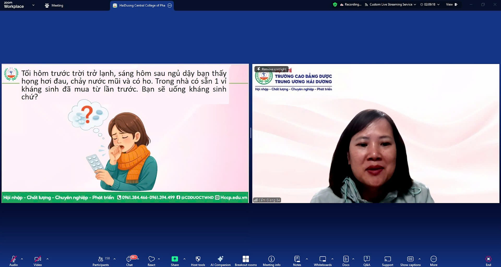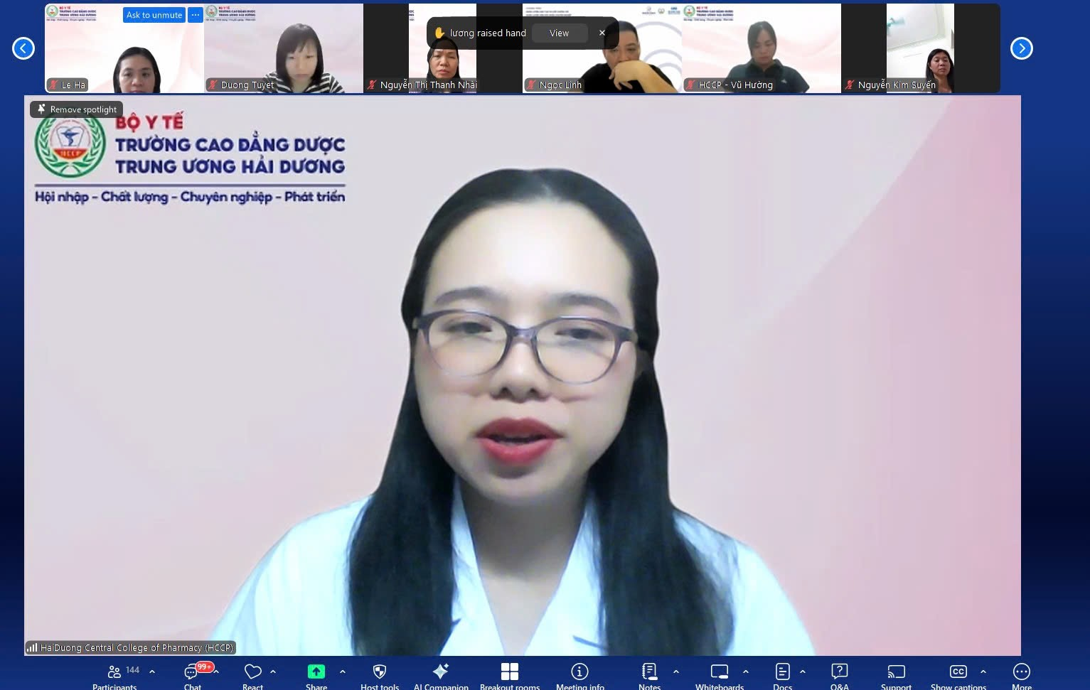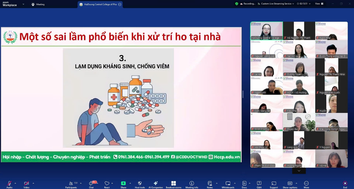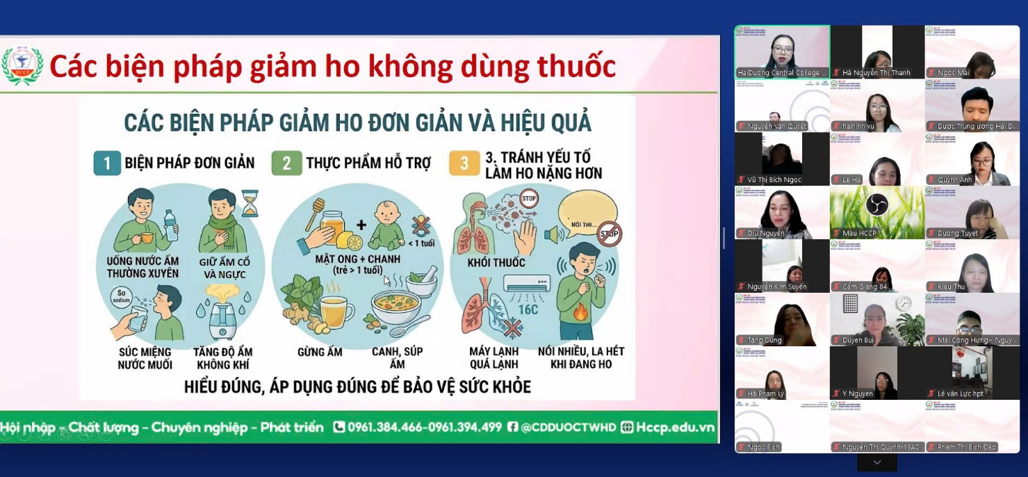 Tối ngày 14/3/2026, Trường Cao đẳng Dược Trung ương Hải Dương đã tổ chức talk show với chủ đề “Ho – Hiểu đúng để xử trí đúng” theo hình thức trực tuyến qua nền tảng Zoom và phát trực tiếp trên fanpage chính thức của nhà trường. Chương trình thu hút đông đảo người theo dõi và tương tác, thể hiện sự quan tâm của cộng đồng đối với những kiến thức chăm sóc sức khỏe thiết thực trong đời sống hằng ngày.