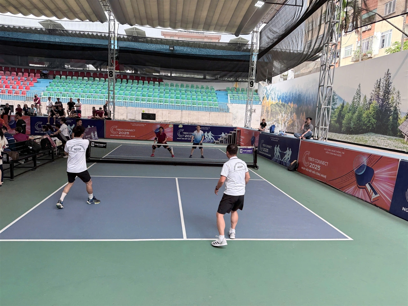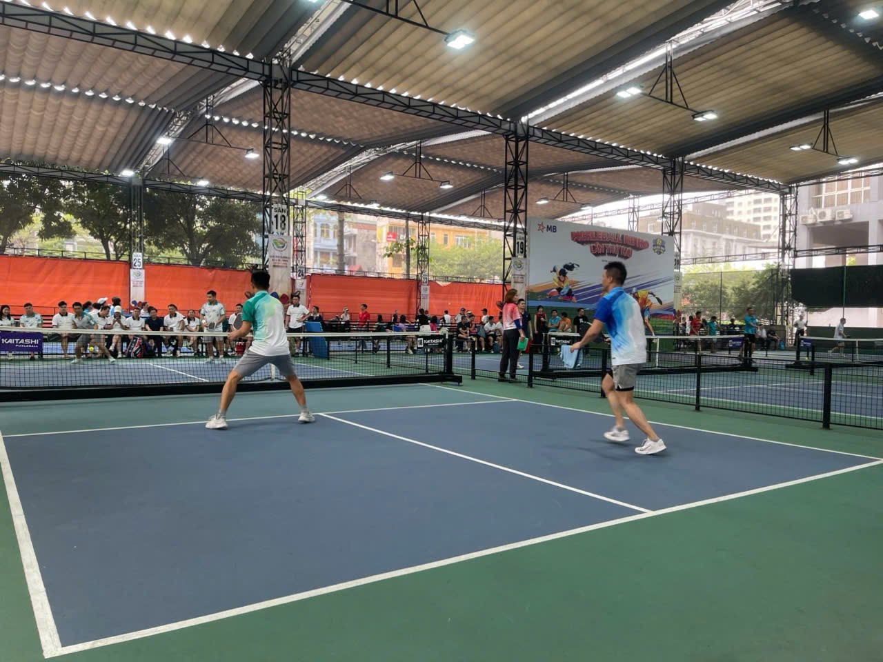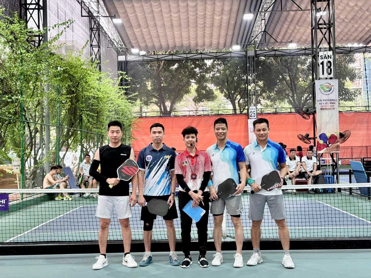 Đôi vận động viên Nguyễn Tân An và Nguyễn Đức Mạnh (Thứ 1, 2 từ phải sang), thi đấu ở nội dung đôi nam dưới 45 tuổi