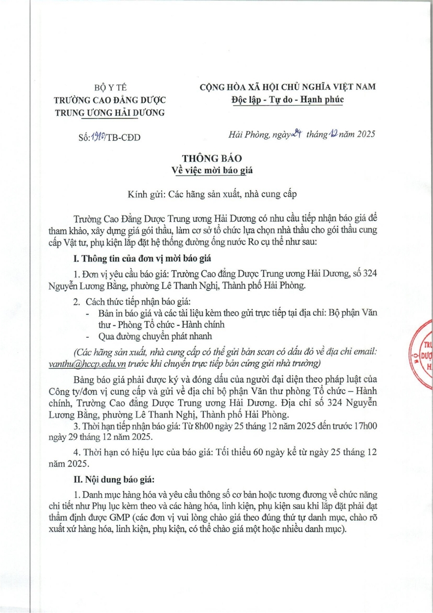THÔNG BÁO VỀ VIỆC MỜI CUNG CẤP BÁO GIÁ THÁNG 12 NĂM 2024