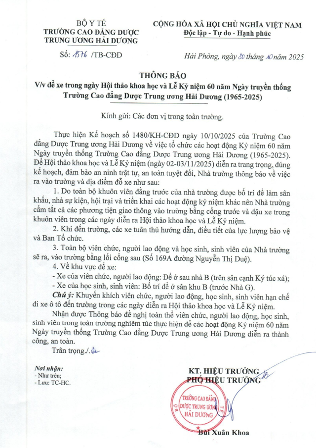 Thông báo v/v để xe trong ngày Hội thảo khoa học và Lễ Kỷ niệm 60 năm Ngày truyền thống nhà trường