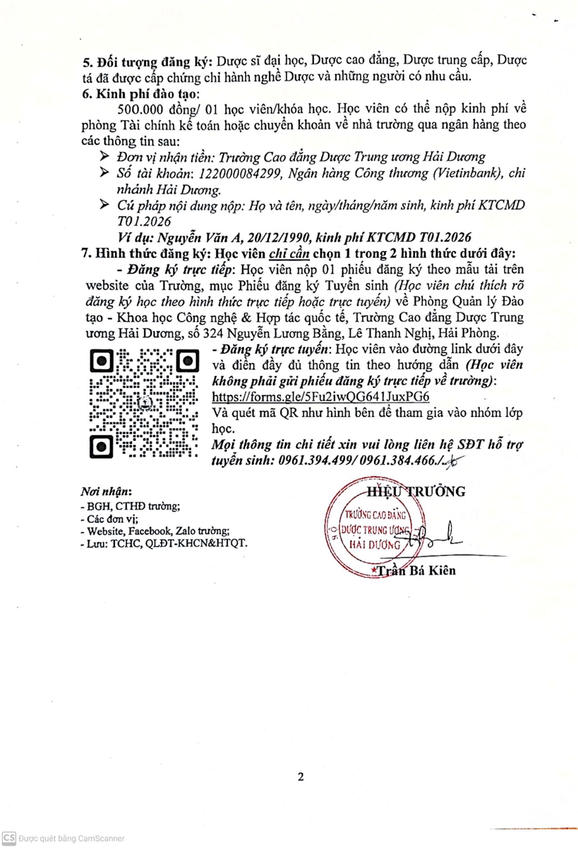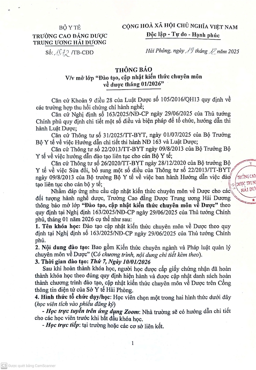 Thông báo v/v mở lớp "Đào tạo, cập nhật kiến thức chuyên môn về dược tháng 01/2026