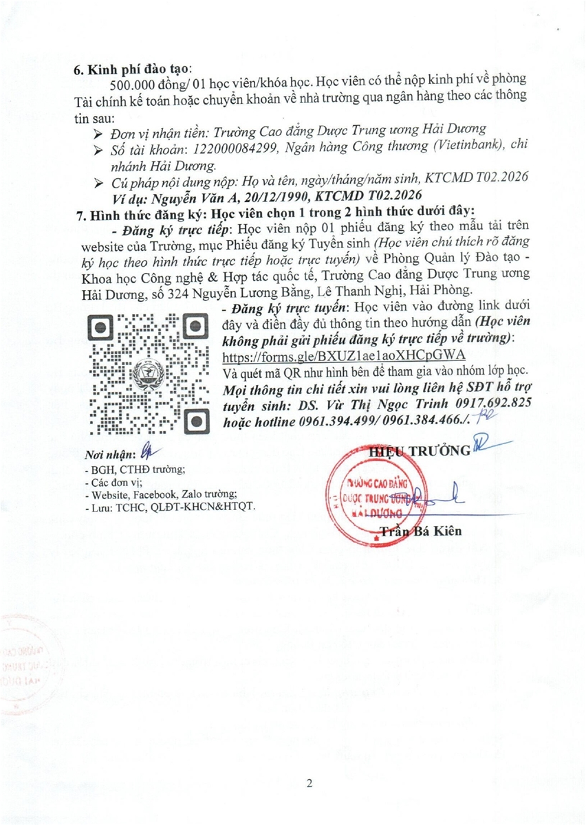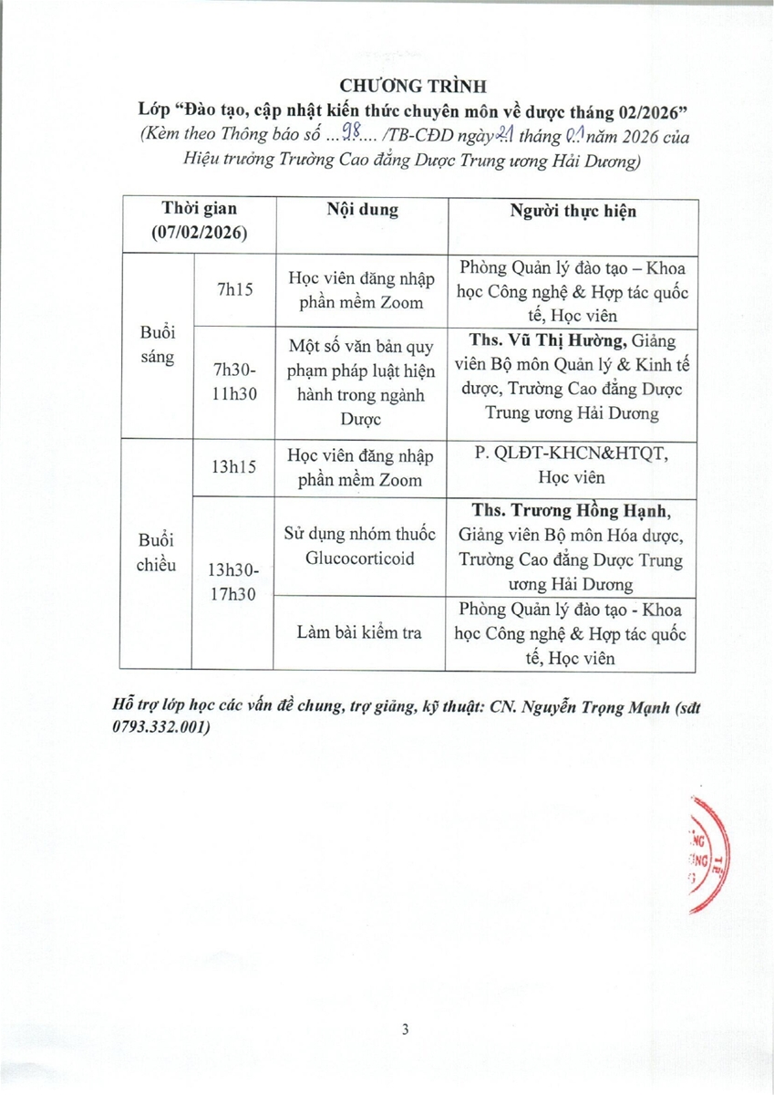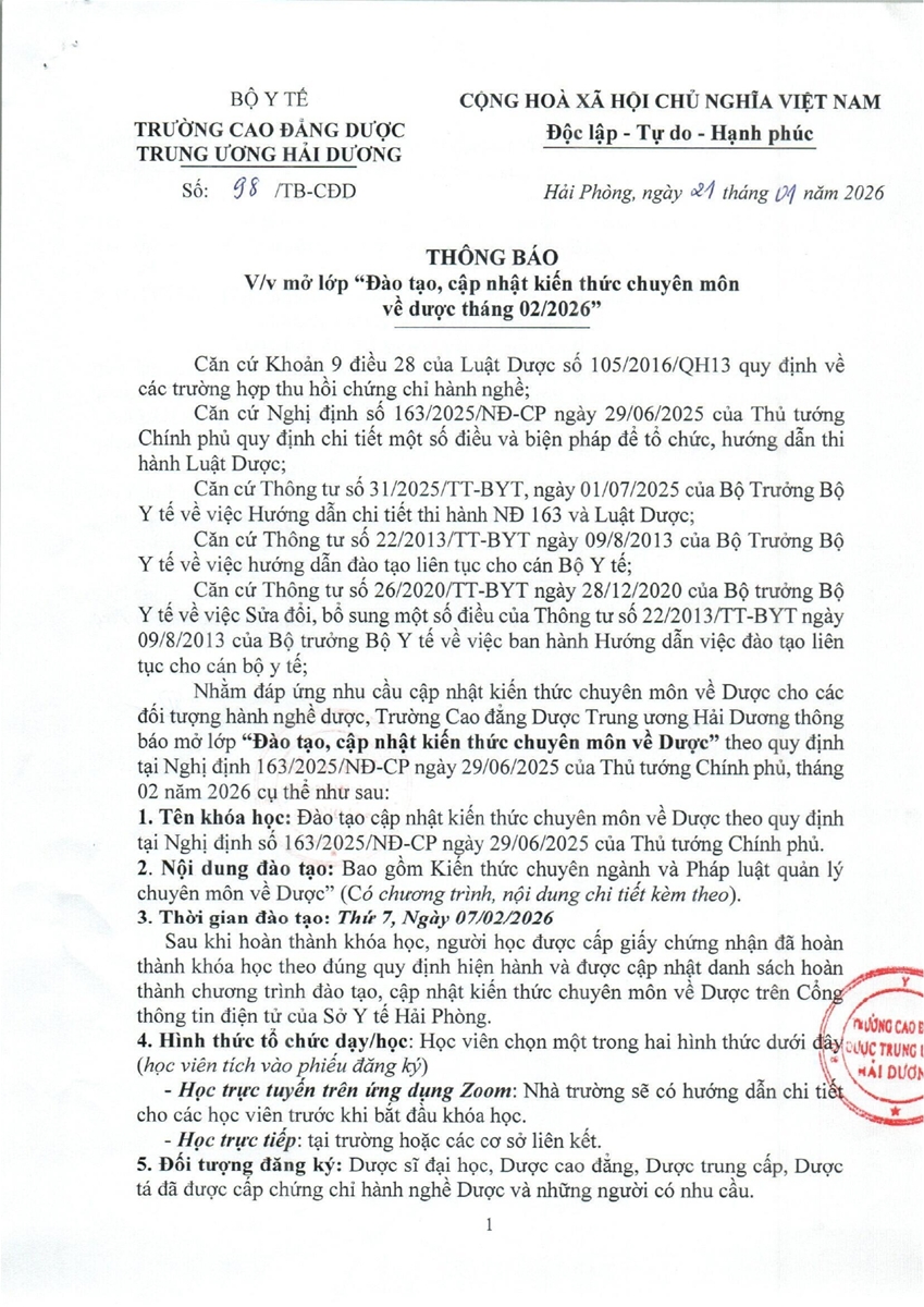 Thông báo v/v mở lớp "Đào tạo, cập nhật kiến thức chuyên môn về dược tháng 02/2026"