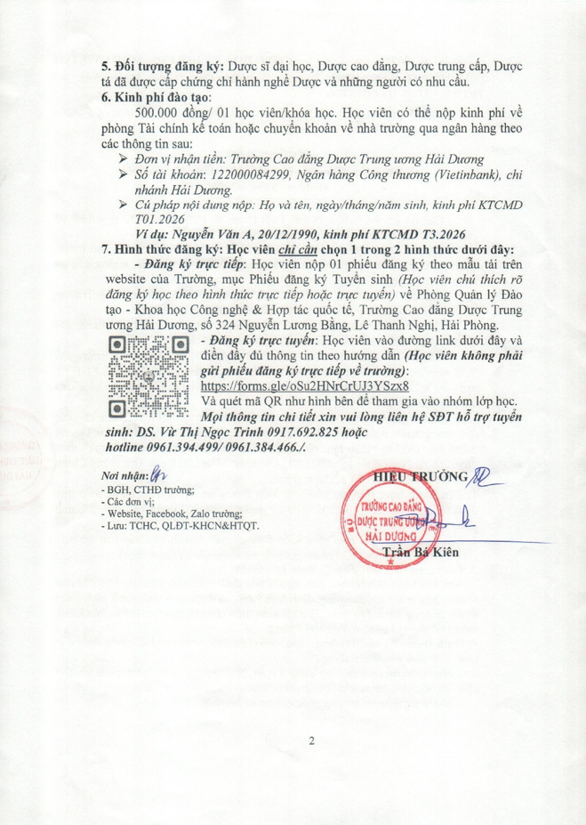 Thông báo v/v mở lớp "Đào tạo, cập nhật kiến thức chuyên môn về dược tháng 01/2026