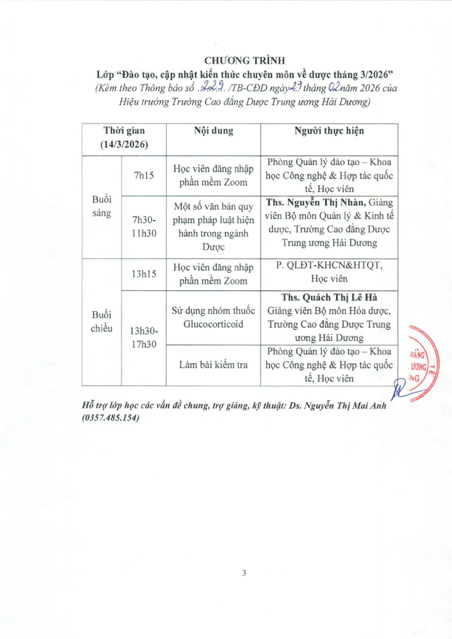Thông báo v/v mở lớp "Đào tạo, cập nhật kiến thức chuyên môn về dược tháng 3/2026"