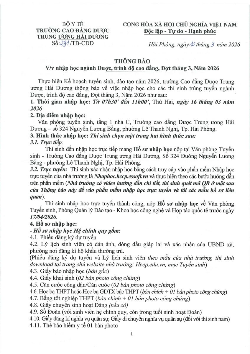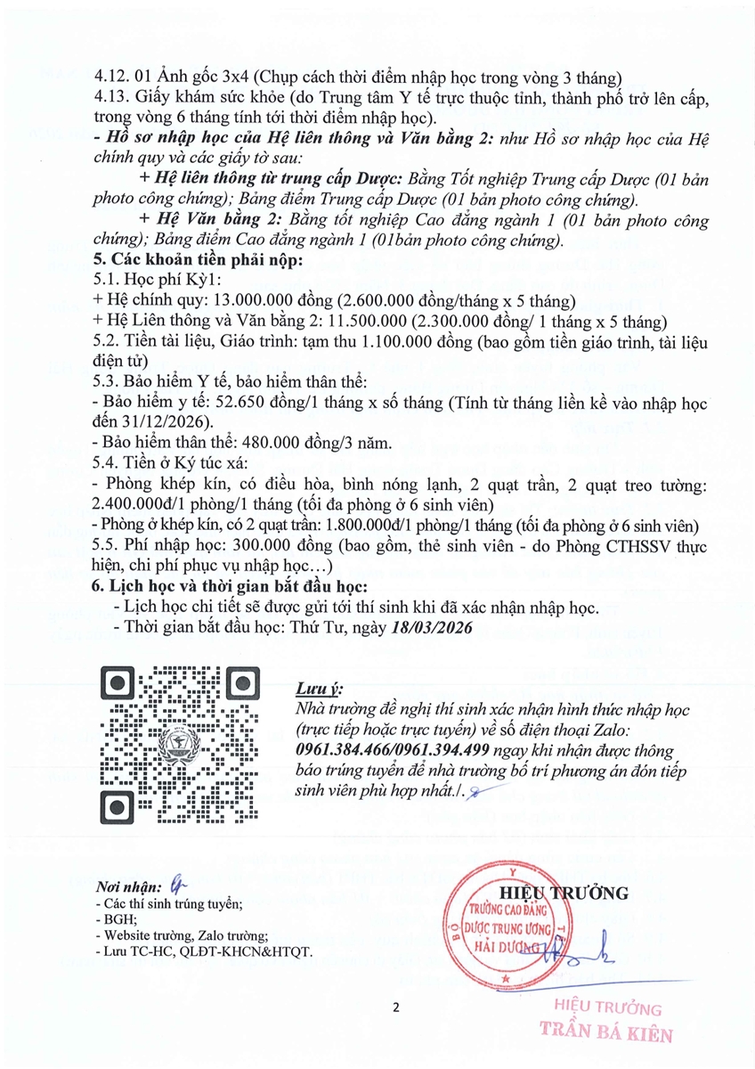 Thông báo v/v nhập học ngành Dược, trình độ cao đẳng, đợt T3/2026