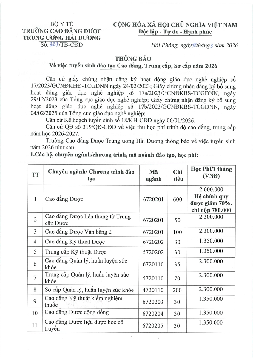 Thông báo v/v tuyển sinh đào tạo Cao đẳng, Trung cấp, Sơ cấp năm 2026