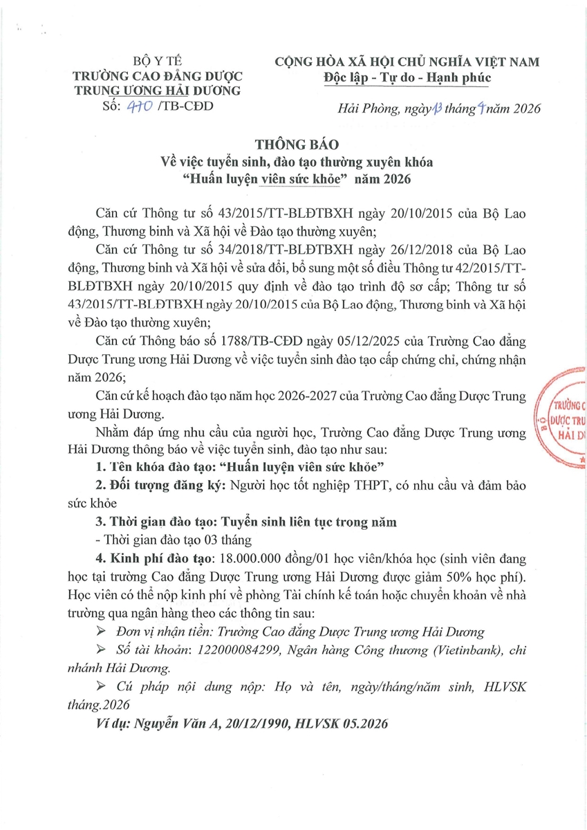 Thông báo v/v tuyển sinh, đào tạo thường xuyên khóa "Huấn luyện viên sức khỏe" năm 2026