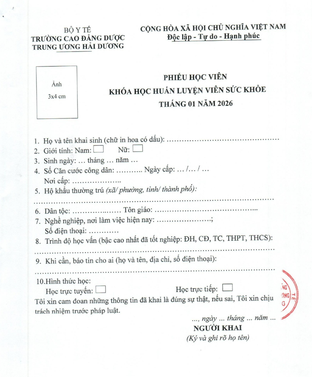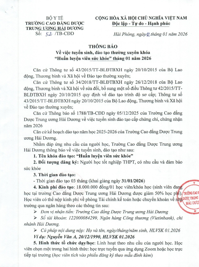 Thông báo v/v tuyển sinh, đào tạo thường xuyên khóa "Huấn luyện viên sức khỏe" tháng 01/2026