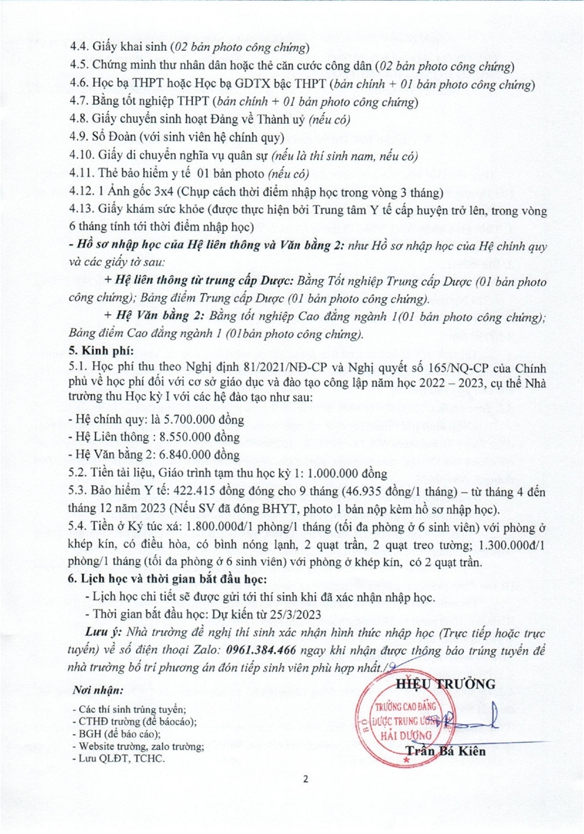 Thông báo về việc nhập học Dược cao đẳng, đợt tháng 3, năm 2023