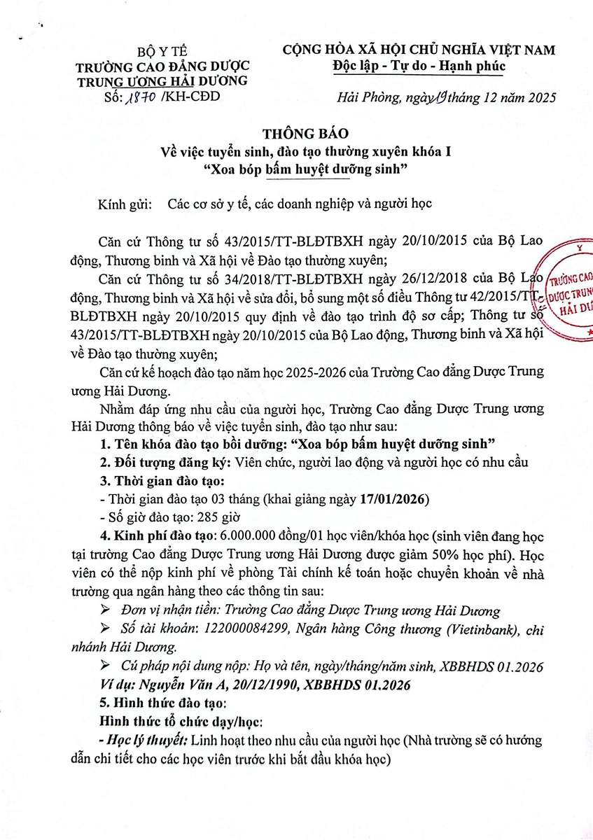 THÔNG BÁO VỀ VIỆC TUYỂN SINH ĐÀO TẠO THƯỜNG XUYÊN KHÓA 1 "XOA BÓP BẤM HUYỆT DƯỠNG SINH"