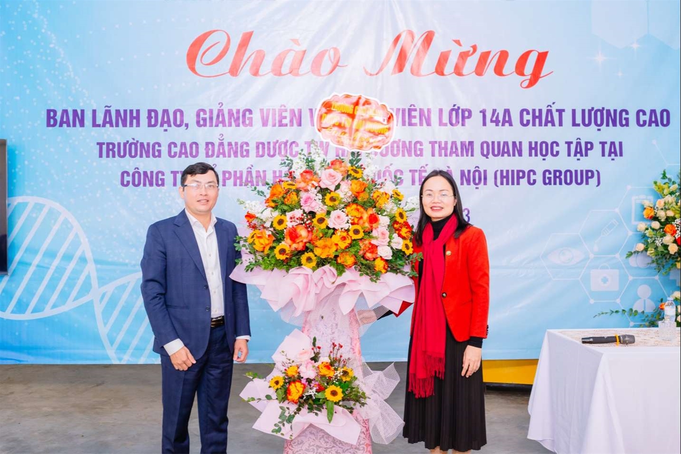 Đại diện Nhà trường, DSCK II. Nguyễn Thị Thanh Nhài tặng hoa chúc mừng công ty Nhân dịp kỷ niệm 68 năm ngày Thầy thuốc Việt Nam (27/02/1955 - 27/02/2023) và cũng là kỷ niệm 16 năm thành lập công ty HIPC. Thay mặt CBGV, Sinh viên, Cô gửi lời cảm ơn sự đón tiếp nồng hậu, chu đáo của Quý công ty. Cô kỳ vọng rằng qua buổi tham quan thực tế này, cán bộ và sinh viên nhà trường sẽ học hỏi được nhiều điều, có cái nhìn thực tế cho những lý thuyết được trang bị trên giảng đường. Đồng thời cũng hy vọng sự hợp tác giữa Nhà trường và Quý công ty sẽ ngày càng sâu sắc, phát triển hơn trong tương lai. Chúc Quý công ty luôn thành công trong kinh doanh và phát triển bền vững.