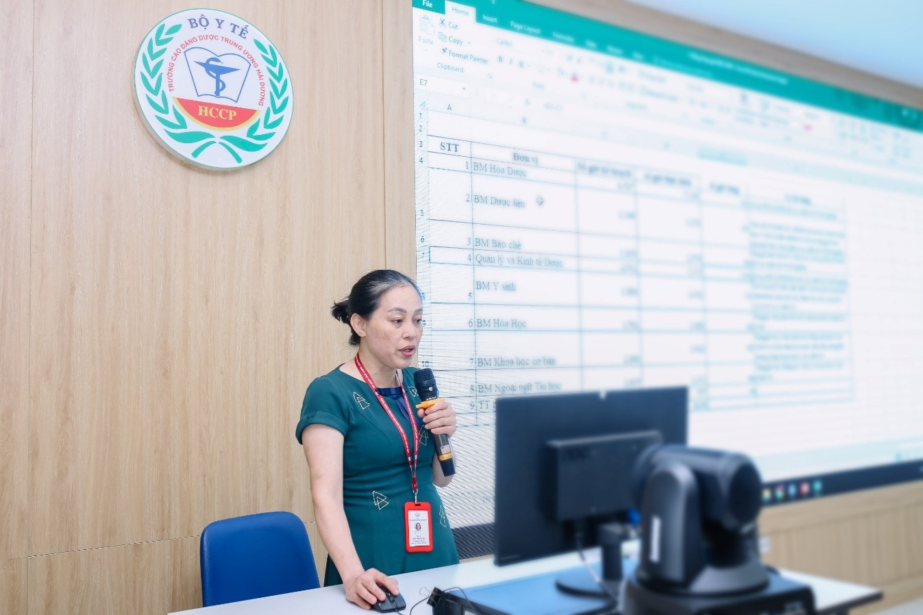 Ths.Nguyễn Thị Dịu, Trưởng phòng Quản lý đào tạo – Khoa học Công nghệ và Hợp tác quốc tế báo cáo tổng hợp giờ giảng năm học