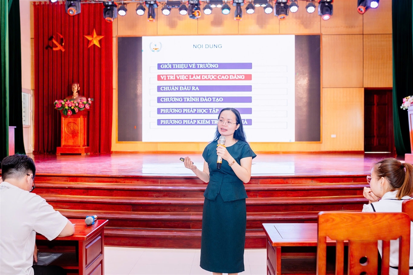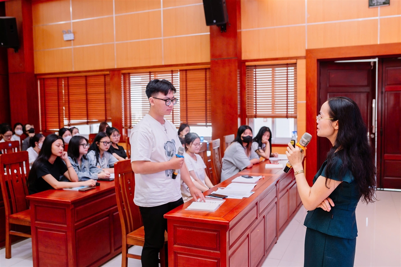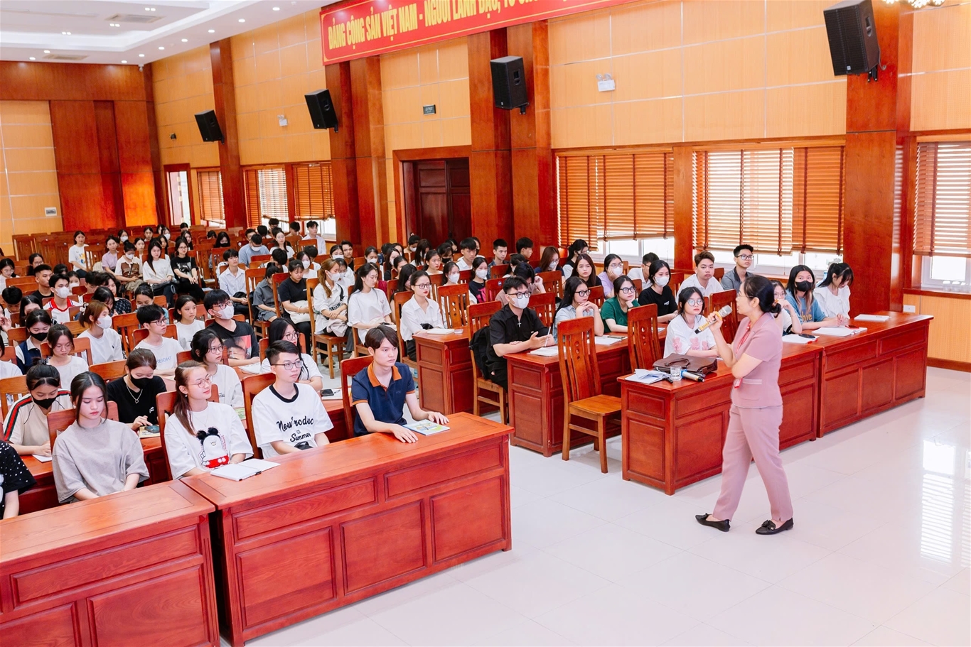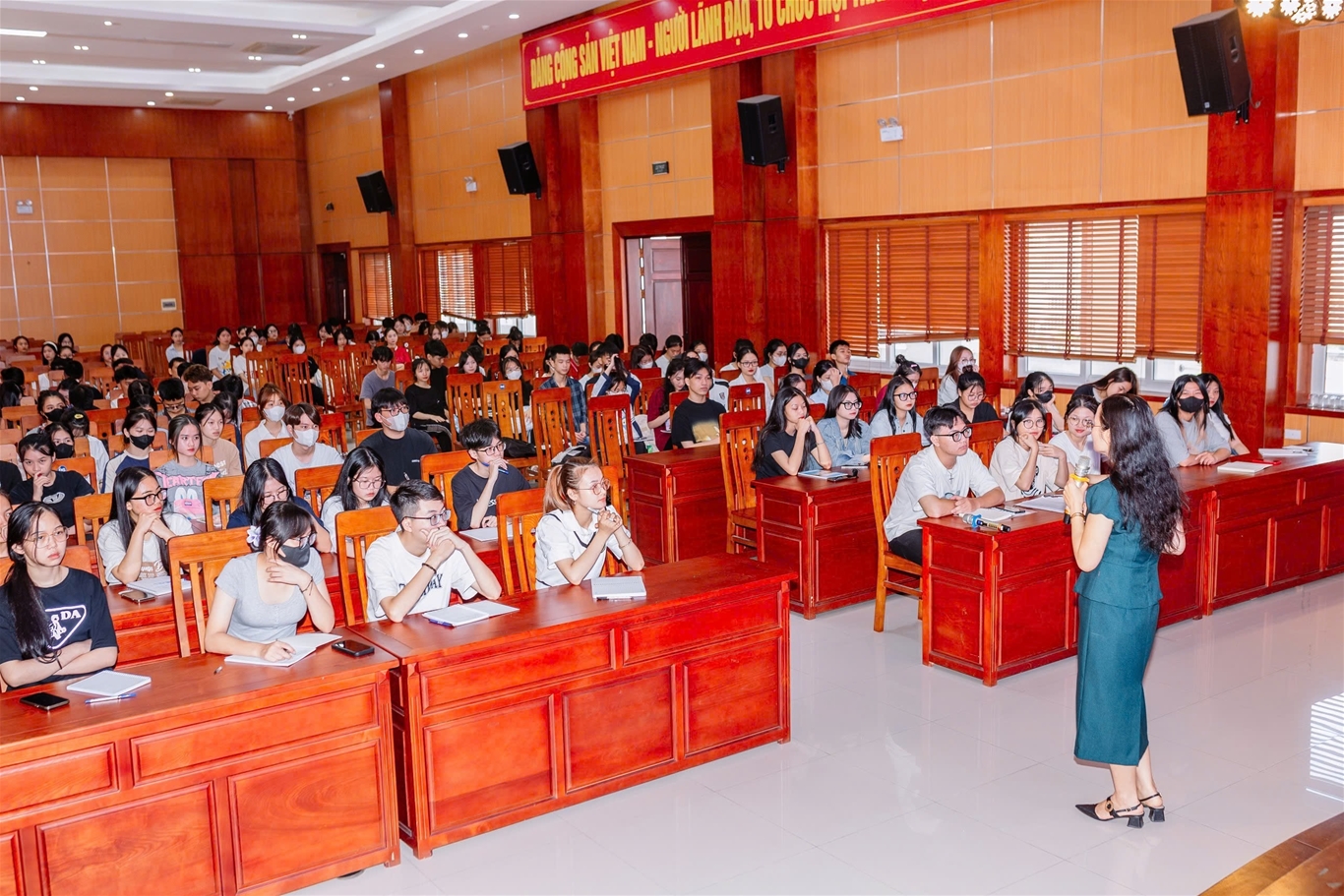Tiến sĩ Nguyễn Thị Hường - Chủ tịch Hội đồng Trường giảng dạy cho sinh viên về giáo dục truyền thống và bộ máy hoạt động của Nhà trường