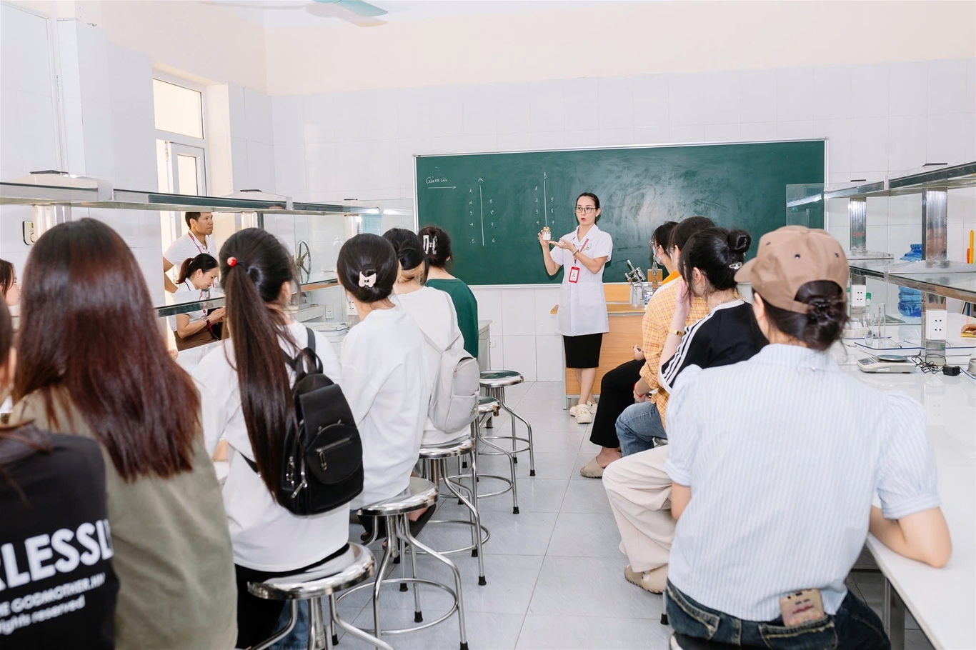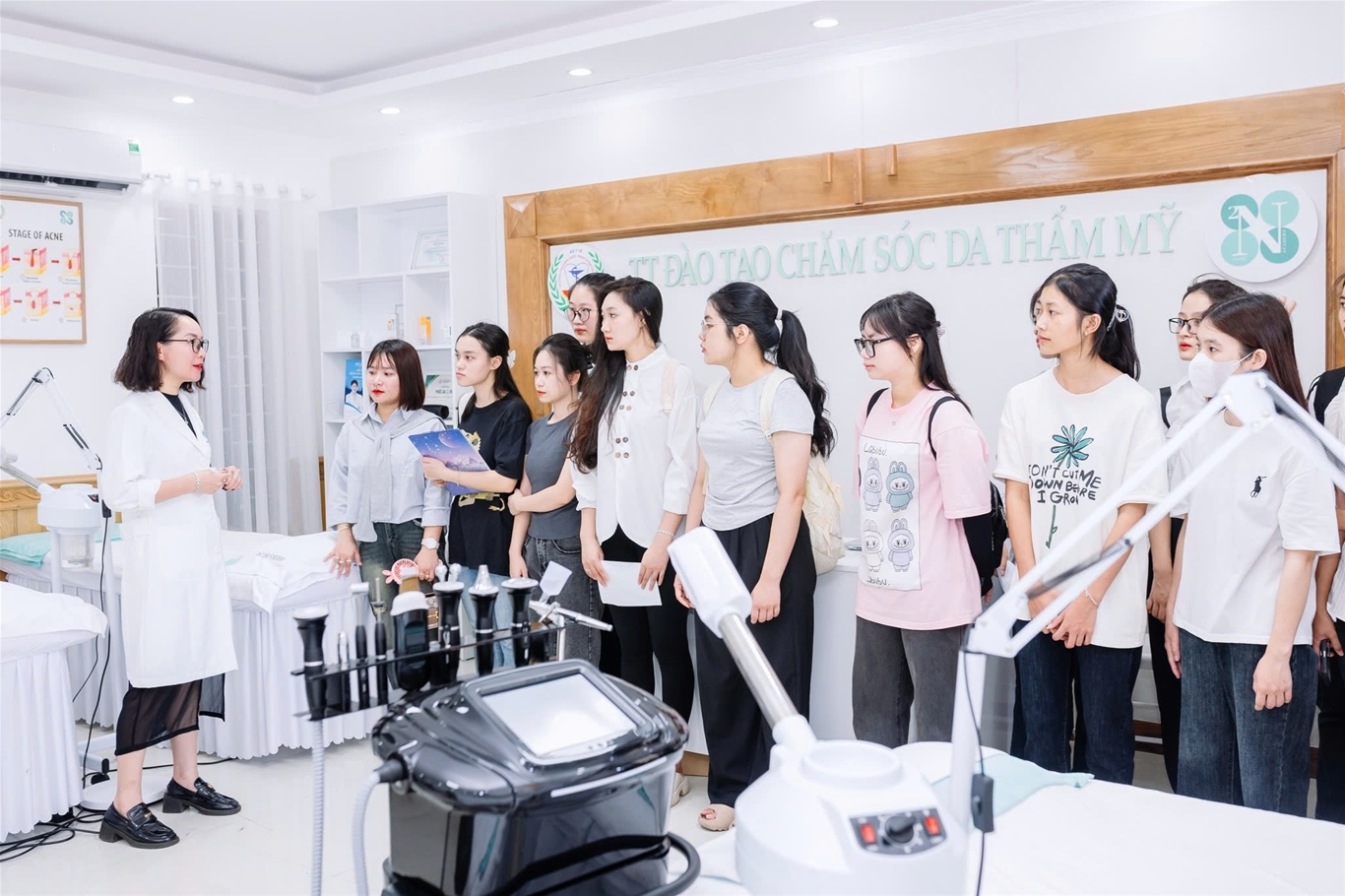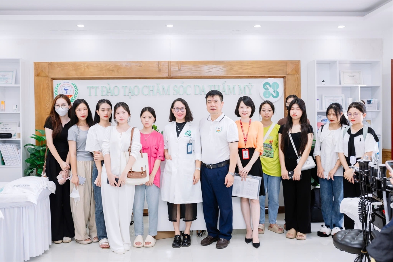 Thạc sĩ Bùi Xuân Khoa - Phó Hiệu trưởng Nhà trường cùng tân sinh viên lớp 17A2 tham quan tại Trung tâm chăm sóc sắc đẹp - Sức khỏe