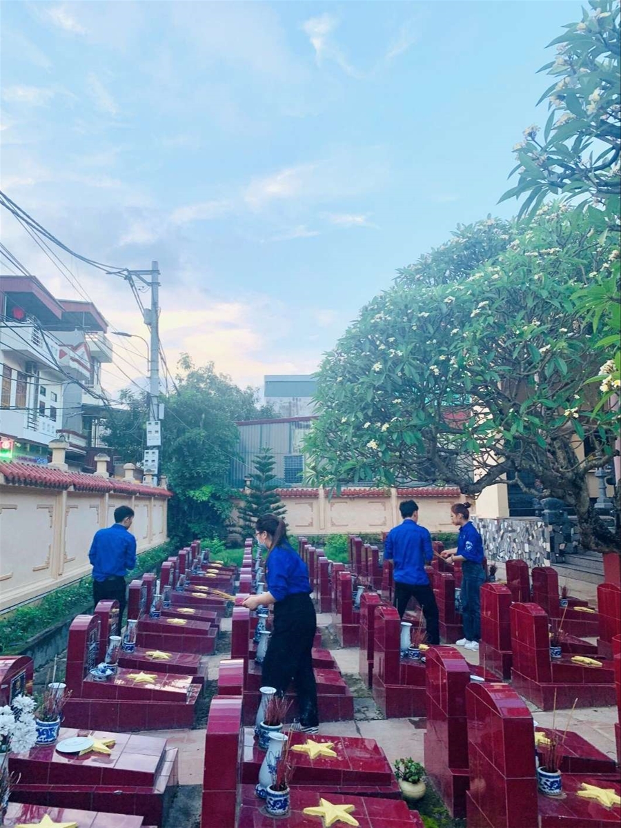 Các đoàn viên đang lau dọn, chỉnh trang các phần mộ liệt sĩ